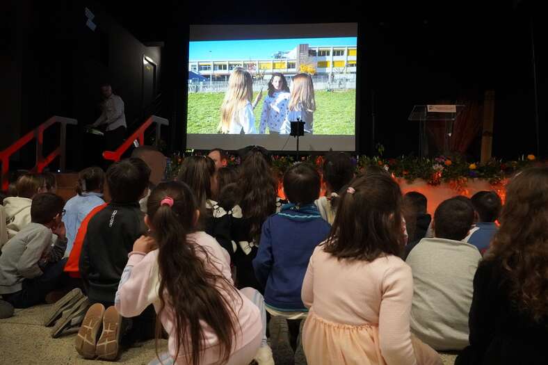 Ensuite, est venu le moment intergénérationnel où une centaine d'enfants des périscolaires des différentes écoles eybinoises ont présenté un texte et des vidéos sur le thème des droits des enfants, travaillé précédemment avec leurs animateurs sur le temps périscolaire.