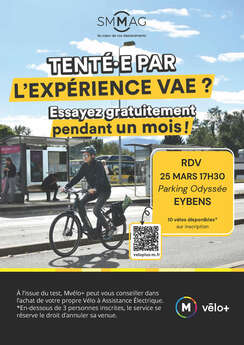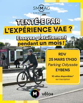 Mvélo+, service de location de vélo et de places de stationnement sécurisés du Syndicat Mixte des Mobilités de l’Aire Grenobloise, propose à 10 habitant(e)s d'Eybens de louer gratuitement un vélo à assistance électrique pendant un mois du 25 mars au 22 avril. L’objectif de cette location est de permettre aux habitant(e)s de la commune d’essayer un vélo à assistance électrique pour les déplacements du quotidien.